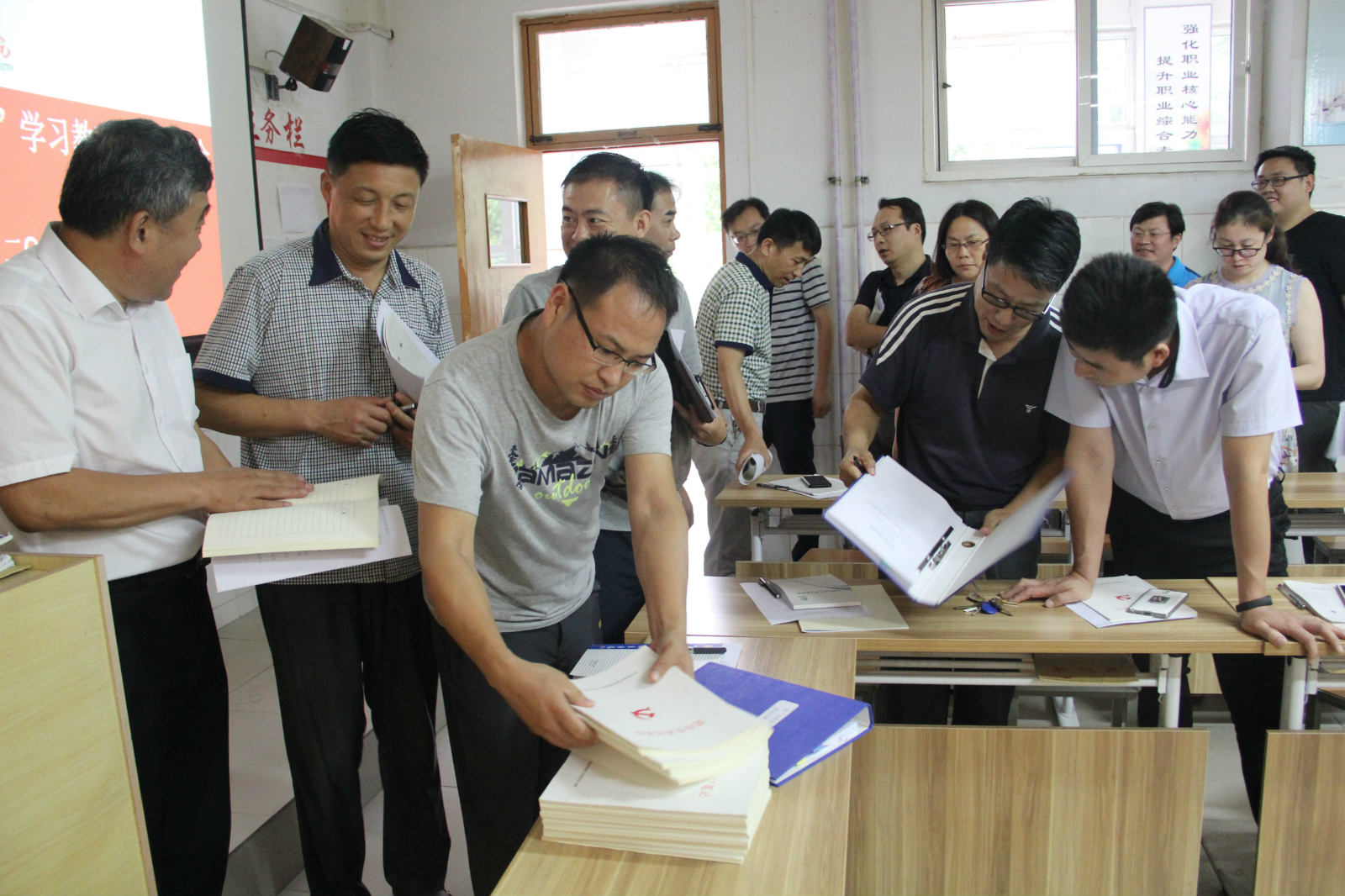 会后,与会人员实地观摩工商管理系党支部党员活动室并查阅相关资料