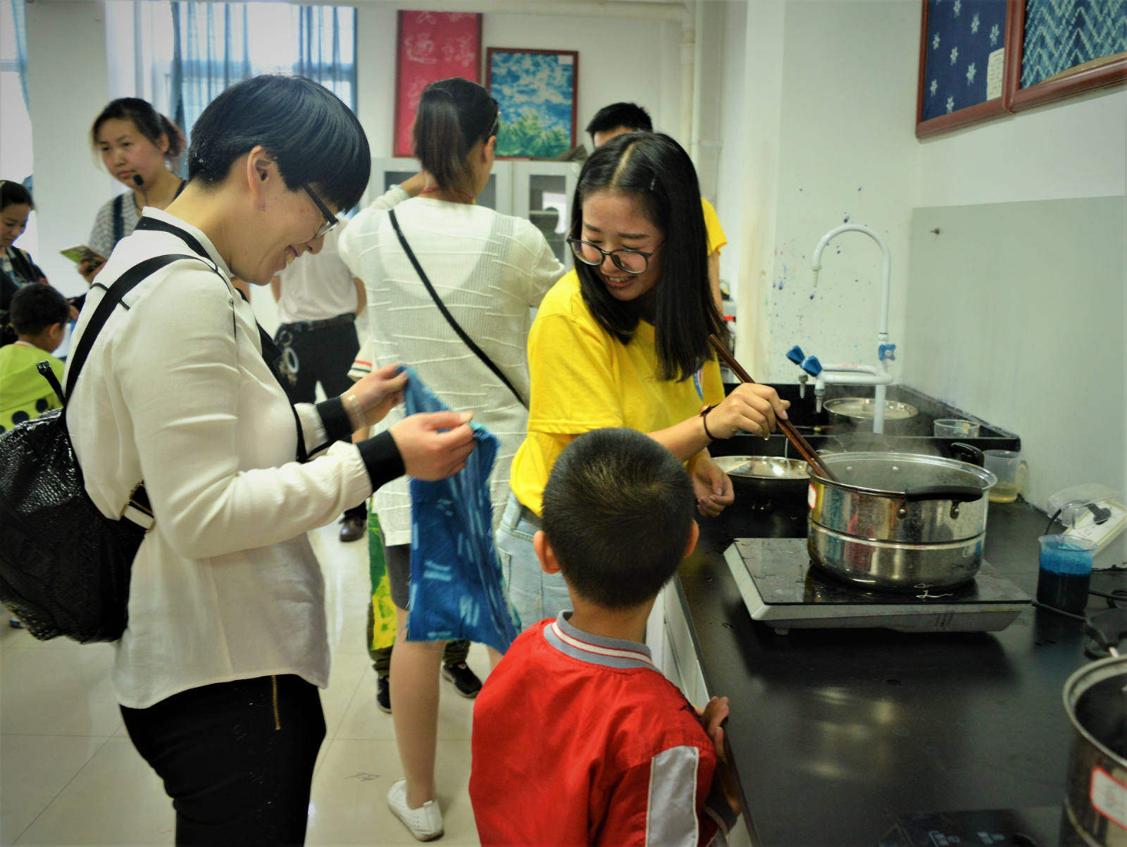 在学院艺术印染中心曹修平教授的指导下,小学生们采用纱、线、绳等工具,充分发挥想象力,对面料进行扎、缝、缚、缀、夹等多种形式的扎结组合。在肖鹏业、徐建建等教师的帮助下进行了染色和后期处理,创造出一系列图案晕色丰富、自然活泼、清新优雅、变化无穷且独一无二的扎染饰品,小朋友们争先恐后的展示自己的创意作品,人人都是小小创意大师。