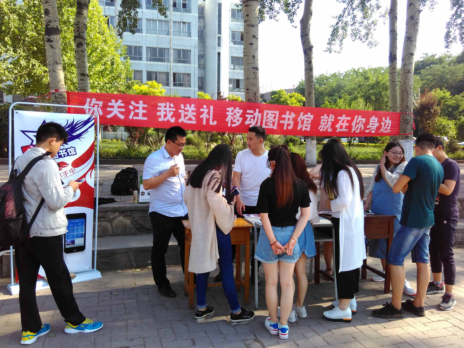 “你关注 我送礼 移动图书馆走进你身边”的宣传活动在大学生文化广场开展。超星公司营销张经理现场教学生如何下载、注册、使用移动图书馆,并赠送小礼品。活动现场一度火爆,学生踊跃参与。他们表示,使用移动图书馆能便捷的查询馆藏图书和借阅信息,还能阅读大量的电子书,非常方便。