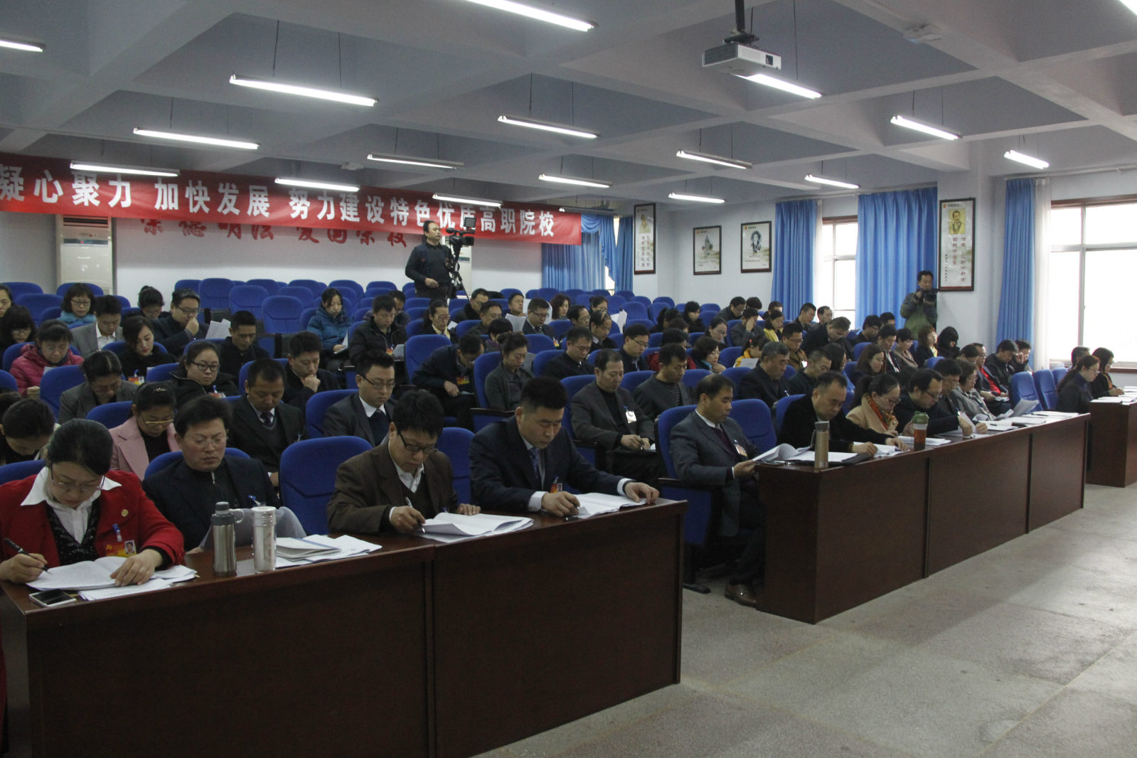 牛圣银向大会作《凝心聚力 加快发展 努力建设特色优质高职院校》的报告。他指出,自升格以来,学院党委团结带领全院党员和师生员工,坚持党的教育方针和社会主义办学方向,励精图治、攻坚克难,各项事业快速发展并取得显著成绩。未来四年是贯彻落实学院《“十三五”发展规划》,努力建设位居全省上游行列的特色优质高职院校的关键时期。学院将以建设特色优质高职院校为目标,全面提升办学水平和综合实力,为淄博经济社会发展和高等职业教育事业做出新的贡献。