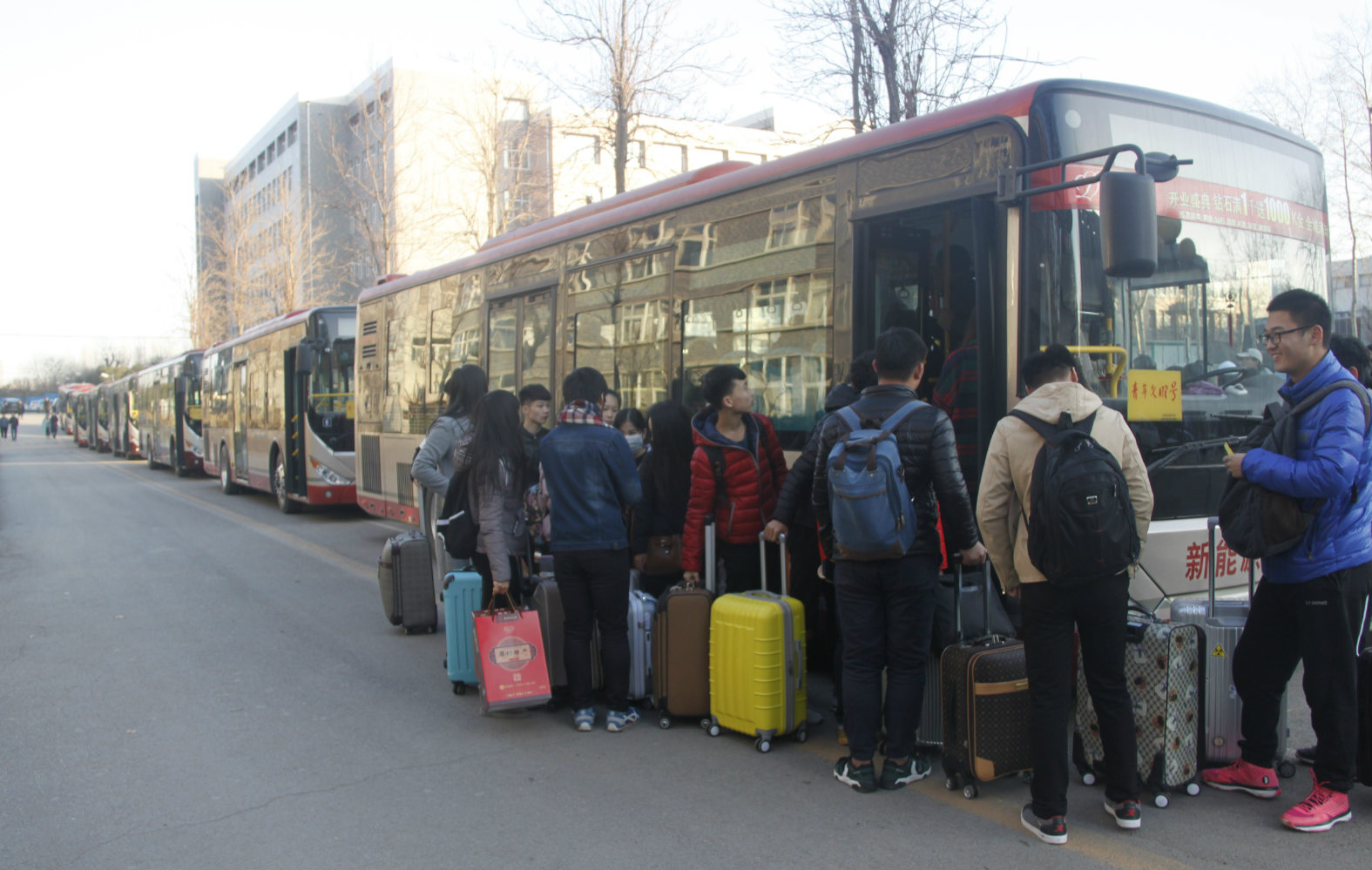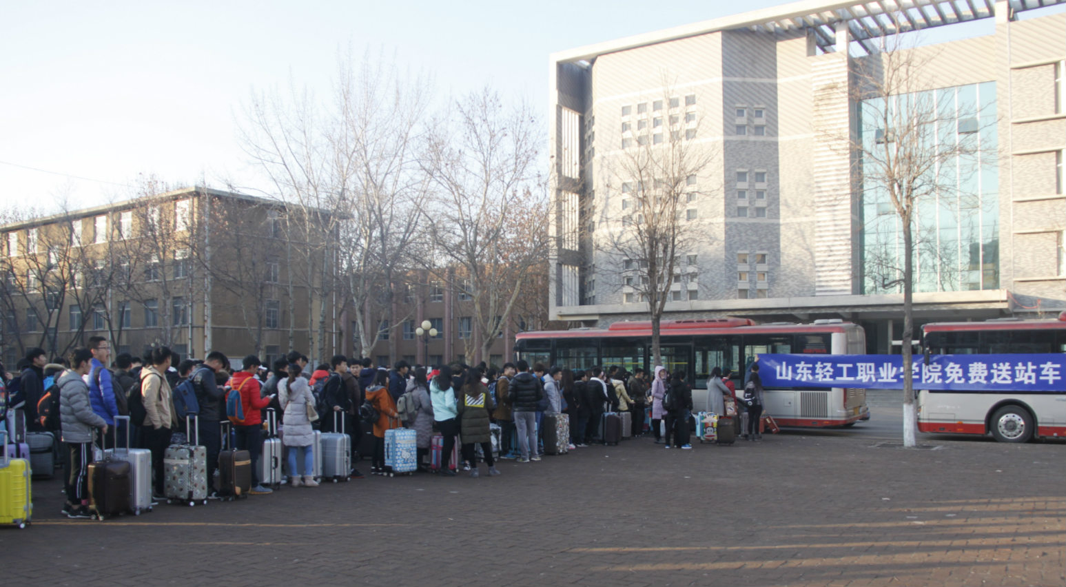 为解决学生放假乘车遇到的实际困难,我院学生工作处决定于元月13日晚,为夜间乘坐火车的的学生提供免费送站服务。根据学生的报名情况,我院共租用大型公交车10辆,免费送站400余人,满足了学生的送站需求。