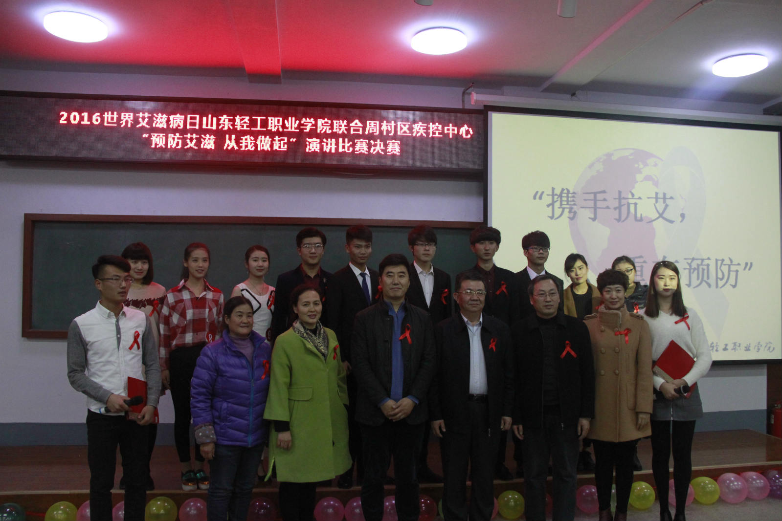 2016年11月29日下午,在第29个“世界艾滋病日”来临之际,由学院后勤处、团委、学生处、爱心社团及周村区疾控中心联合举办的“预防艾滋,从我做起”主题演讲比赛决赛在学院图书馆法治教室圆满落幕,淄博市疾控中心翟慎勇主任、淄博市疾控中心性病与艾滋病防治所杨绪红副所长、周村区卫生局王国臣副局长、周村区疾控中心李晟主任、周村区疾控中心王玺都科长、学院党委委员工会主席公昆等领导专家出席了本次活动。