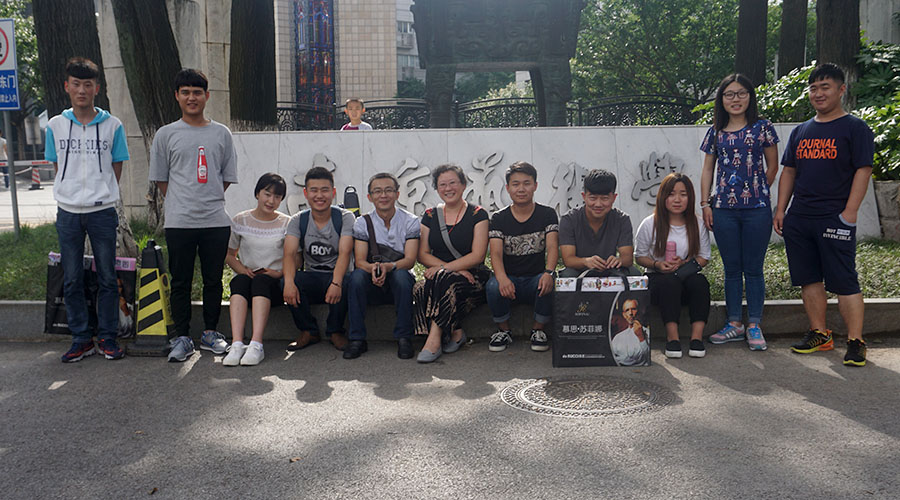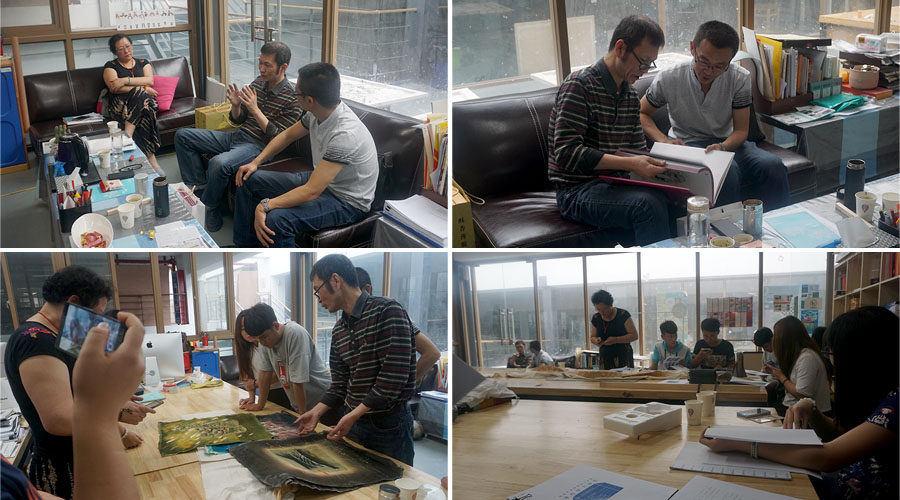 应我院客座教授、南京艺术学院设计学院染服系主任龚建培教授邀约,我们先行来到龚教授工作室拜访老师。龚教授带领我们参观各专业工作室,师生畅谈专业教学与设计创作。周末休息日仍在忙碌的大二学生做课程作业吸引了同学们浓厚的兴趣,纷纷围绕观看。我们拜读了龚教授历时二年半的新著《摩登佳丽——月份牌与海派文化》(中英双语,上海人民美术出版社),书中极具价值的史料图片让我们非常感慨,钦佩龚教授孜孜以求的敬业精神和博大精深的学术造诣。龚教授正在筹备今年8月在马来西亚举办的蜡染个展,“新鲜出炉”的蜡染作品让我们先睹为快。