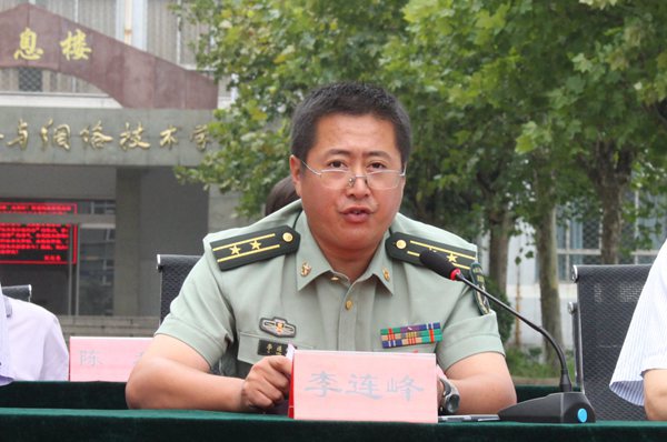 助训部队参谋长李连峰在大会上发言。他讲到,新生军训工作是一项国防军事教育活动,在全面推进素质教育、促进大学生健康成长方面,具有不可替代的作用,希望全体参训学生上好大学第一课,要学习军人的品质、军人的作风、军营的纪律和军营的文化,不断磨砺品质,锤炼意志,锻炼能力,挥洒汗水,收获成长,迈好大学第一步,以优异的军训成果和良好的精神风貌充分展现学院学子的风采。