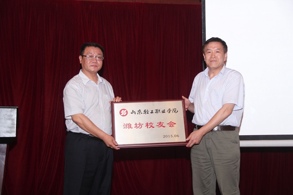 梁菊红副院长宣读山东轻工职业学院潍坊校友会组织机构和组成人员建议名单并提交大会表决,大会通过了建议名单,潍坊海孚丝绸有限公司董事长孙海东当选潍坊校友会会长。张玉惕副院长向潍坊校友会授牌,山东轻工职业学院潍坊校友会正式成立。