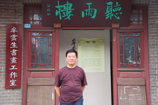 穿过小路来到一处宽阔的平台前,这个平台是古时候为居民、商户、游客观赏戏曲搭建的,“听雨楼”就坐落于此。听雨楼一眼望去,古朴典雅,两层排列浑然一体。上下并列两块牌匾,上题“齐鲁一家”,下书“听雨楼”,体现了楼主高深的艺术造诣和谦和朴素的人格魅力,此情此景让人不由自主地想起宋代诗人陆游的“小楼一夜听春雨,深巷明朝卖杏花”著名诗句。牟老早已在门外等候,初见牟老,并非想象中的头发花白、仙风道骨那般传统形象。短暂寒暄后,他领我们进门后绕过屏风来到不太大甚至可以说是略显局促的会客厅,中央是一张小桌三把藤椅,桌上拜访着普通款式的小茶具,可以看出主人简朴的生活和好客的性格。