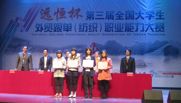 11月23日至24日,第三届全国大学生外贸跟单(纺织)职业能力大赛在浙江理工大学举行,我院纺织品检验与贸易专业学生与来自全国38支代表队的高校大学生同台竞技,取得优异成绩。其中周丽敏、孙亚茹获得一等奖,吕传宝获得三等奖,获奖率100%,在38所参赛高等院校中,团体成绩紧随浙江理工大学(主办方)之后,获得总分第二名,团体一等奖的好成绩。