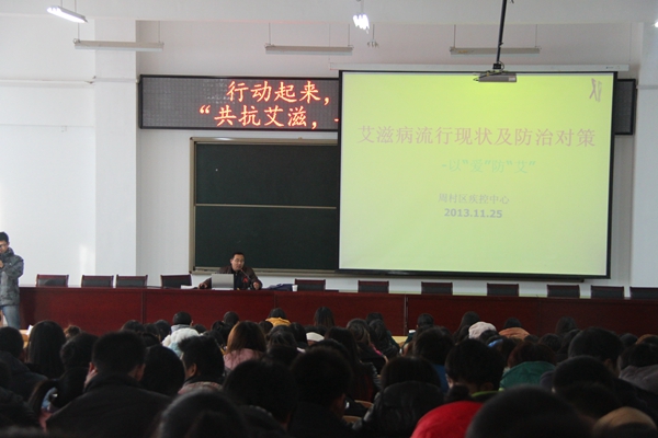 2013年12月1日是第26个“世界艾滋病日”,为提高广大青年学生艾滋病防治水平,由周村区艾滋病防治办公室主办、周村区疾控中心及学院承办的“艾滋病防治知识进校园”活动于11月28日下在我院第六教学楼506教室举行。周村区副区长李寅萍、周村区卫生局副局长孔祥红、周村区疾控中心主任鲍泽亮及我院副院长明绪田等领导出席了活动。各系老师、同学代表共300余人积极参与,在印有“行动起来,向‘零’艾滋迈进---‘共抗艾滋,共担责任,共享未来’”的横幅上签下了自己的名字。随后,聆听了周村区疾控中心健康教育科王玺都科长题为《艾滋病流行现状及防治对策——以“爱”防“艾”》的防艾知识讲座,并认真填写现场调查问卷、积极发言互动。
