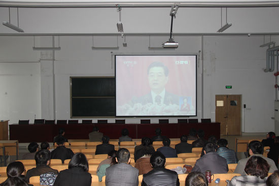 118上午9:00,学院领导班子成员、全体党员、部门负责人在纺织楼506教室集中收看了中国共产党第十八次全国代表大会开幕式直播,聆听了胡锦涛总书记代表第十七届中央委员会所作的工作报告。