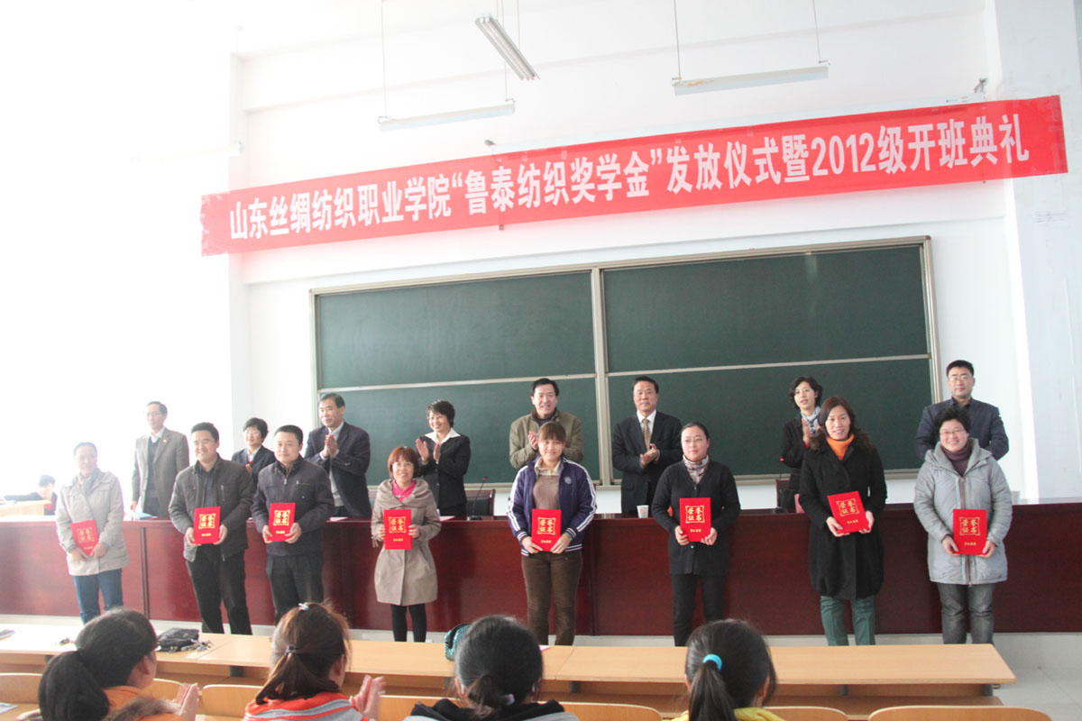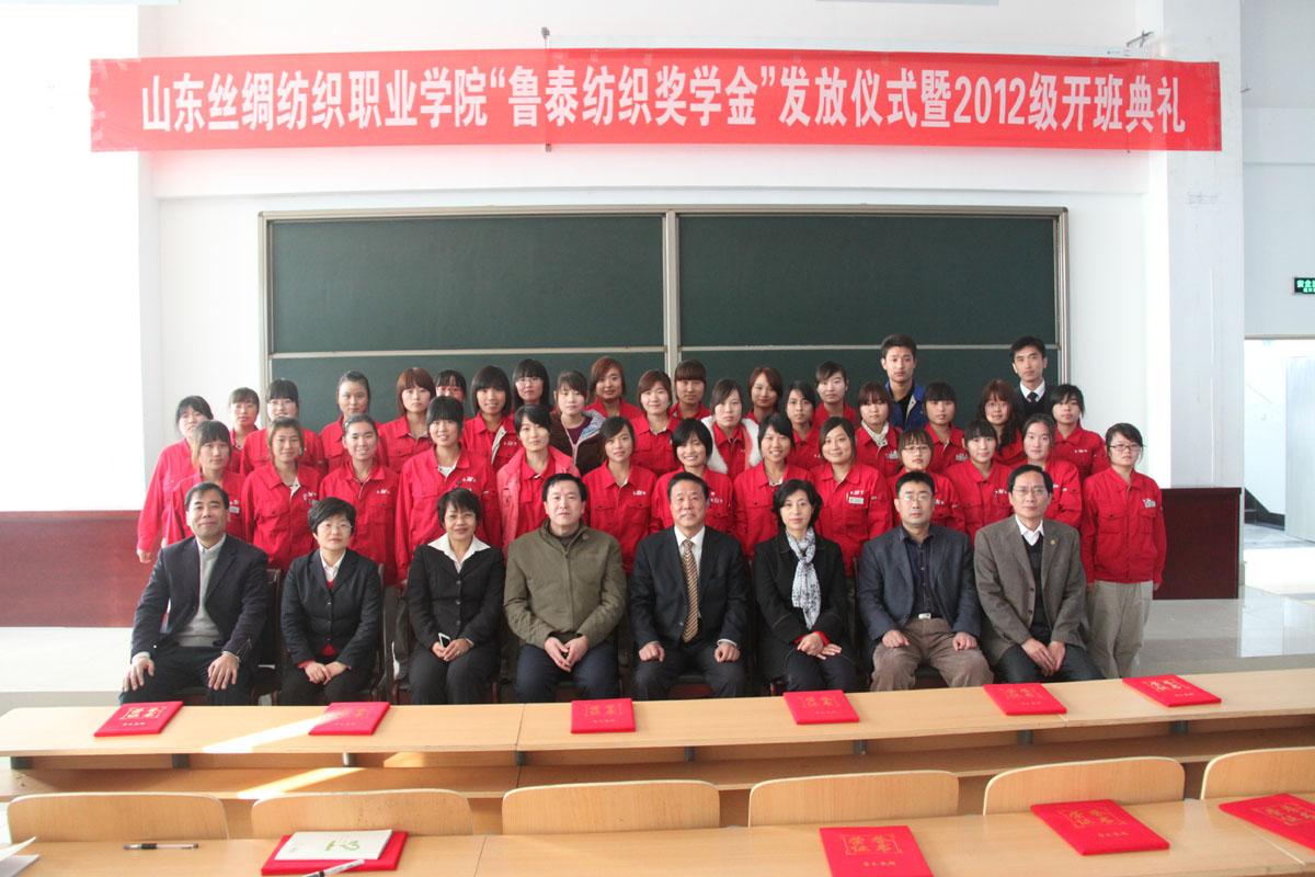 学院副院长张玉惕致辞,欢迎鲁泰纺织股份有限公司各位领导,并向获奖的老师表示敬意,向获奖的同学表示祝贺,向2012级“鲁泰班”的新同学致以美好的祝愿。 吴艳珍经理宣读了《关于表彰山东丝绸纺织职业学院第三届“鲁泰纺织奖学金”获奖师生的决定》,之后,公司及学院领导共同为获奖师生颁奖。此次共有20名教师及67名学生获奖。 获奖教师、学生代表、2012级鲁泰班学生代表分别发言,表示在今后的工作和学习中,爱岗敬业、努力学习、刻苦钻研,为学院争光,为企业做出贡献。 最后,鲁泰纺织股份有限公司李同民副总经理代表公司讲话,对公司和学院长期以来的合作表示满意,并对双方今后开展更深层次的合作提出了期望。 职业教育的发展,离不开企业的支持,企业的发展离不开人才的支撑。学院与鲁泰公司的合作到现在已有二十余年时间,今后,双方将本着优势互补、互利共赢的原则,创新合作模式,开展更深层次的合作,促进共同发展。 仪式结束后,与会领导与获奖师生共同合影留念。