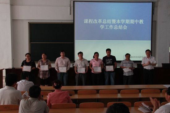 张玉惕副院长宣读了《关于对2011年度优质课程改革项目表彰的决定》(鲁丝院教字【2012】12号),对贾长兰、王开苗、杜世凤等15位教师的课程改革成果进行了表彰奖励,学院院长孙志斌向获奖教师颁发了荣誉证书。随后,一等奖获得者贾长兰、王开