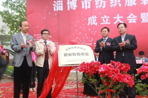 山东省教育厅总督学徐曙光,淄博市人民政府副市长韩国祥,中国纺织服装教育学会会长倪阳生,山东省丝绸协会会长许华东为淄博市纺织服装职业教育集团揭牌