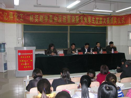 “亿得化工”奖助学基金是学院与上虞亿得化工有限公司开展的“染整技术专业创新培养人才”项目的一项重要内容,用于奖励染化工程系染整技术专业的家庭经济暂时困难并励志成才学生与学习型、创新型优秀学生,每年9月份开始评选。“染整技术专业创新培养人才”项目的另外一个重要内容是“亿得化工”专业实践活动基金,包括每年6月份的染整技术专业知识竞赛、每年11月份的染整技术专业学生技能大赛、创新科研项目课题基金和就业创业指导基金四个方面内容,目的在于提高学生专业技能,培养与提高学生的科研创新能力,并对学生的独立创业进行指导和扶持。另外,双方在科技攻关、人才培养与技术信息咨询服务等多个方面也进行了深入合作。