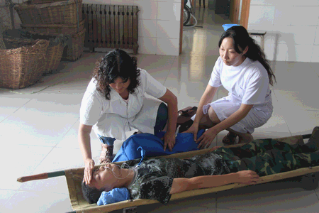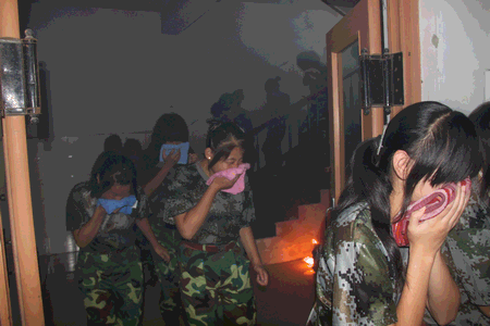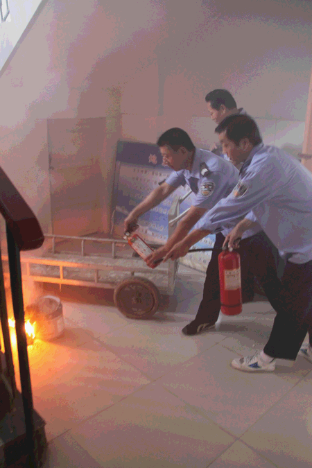 14时30分,演练现场总指挥、院工会主席明绪田宣布消防演练开始,只见五、七、八号新生公寓楼道同时发生火情,刚要准备参加军训的同学们突然发现着火后,立即电话报警,通知公寓值班室和保卫处值班室人员。疏散引导组老师通过喊话、发出灯光信号等方式引导火场人员在应急照明灯的帮助下,采取正确方式、沿正确路线安全、有序快步撤离火场。保卫处值班人员接到报警电话后,立即手提便携式干粉灭火器,分为3组及时赶到“发生火灾”的公寓现场,用灭火器和水扑灭大火。此时,院医院人员携带卫生箱、担架等急救器械赶到现场,对出现“身体不适”的同学立即进行“抢救”。在疏散组老师的指挥下,1700余名同学在8分钟时间内到达发生火灾宿舍楼外事先预定的临时集合处,进行点名清点人数。
