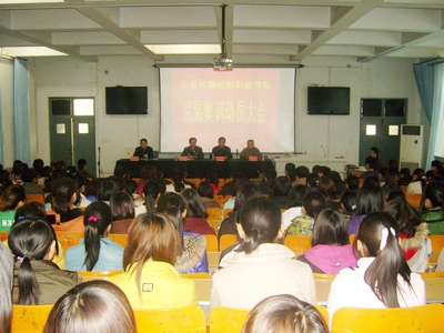 经过前期的宣传、筹备,我院共有628名女生报名参加武装集训,经过2次选拔有143名女同学被选为集训人员。2010年4月14日下午4点,我院武装集训工作动员大会在多媒体教室隆重举行。周村区武装部政委宋程远、科长孙钢、学院副院长刘承新、工会主席明绪田及各系副主任、团总支书记和143名参训学生参加了大会。