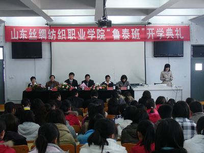 2010年3月16日,山东丝绸纺织职业学院“鲁泰班”开学典礼仪式在学院多媒体报告厅隆重举行。鲁泰纺织股份有限公司总经理刘子斌、人力资源部经理吴艳珍、人力资源部副经理赵洪,山东丝绸纺织职业学院院长孙志斌、副院长张玉惕、部分系、室相关人员及“鲁泰班”全体学生参加了开学典礼。开学典礼由学院副院长梁菊红主持。