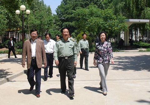 学院党委书记高素贞(右一)院长孙志斌(左一)陪同淄博军区司令员鞠洪仑(中)等参观校园建设