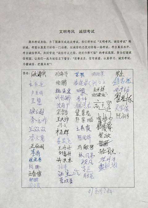 在誓言书上,全院学生郑重地签下自己的名字,体现了广大同学拒绝作弊的决心,以诚信竖立起我院的优良考风考纪,以踏实的努力和出色的发挥来对待每一场考试!
