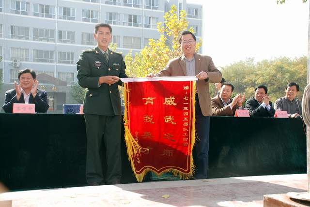 院长孙志斌代表我院向71345部队工防营赠送了锦旗。承训部队王宁营长作了讲话,他对于我院新生在军训中发扬出来的吃苦耐劳精神给予了充分的肯定,对军训成果给予了高度评价。
