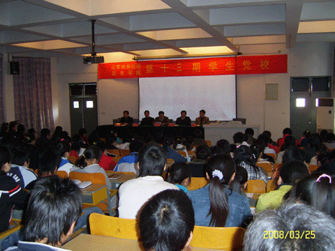 2008年3月25日下午,我院第十三期学生党校在雄壮的国歌声中举行了开学典礼。学院党委书记王济雨、党委副书记李学静、副院长刘承新、学生处主任刘效东出席了本次开学典礼。典礼由院团委书记袁雷主持,刘主任宣读了党校学员学习管理规定,袁书记宣布党校班委会名单。第十三期学生党校学员代表06普专纺品1班班鲁江代表本期学员做了表态,提出“要珍惜这次好的学习机会,努力提高锻炼自己,使自己早日成为符合时代要求的合格共产党员”。学生党员代表刘美从切身谈了党校学习的感受,并从党的思想理论学习、理论与实践相结合抓好学习等方面对本学期学员提出了一些希望。最后院党委王书记代表党委做了重要指示,从我院基本情况出发对本期学院提出了三点要求,即“努力学习、实现自我价值、积极向党组织靠拢”。
