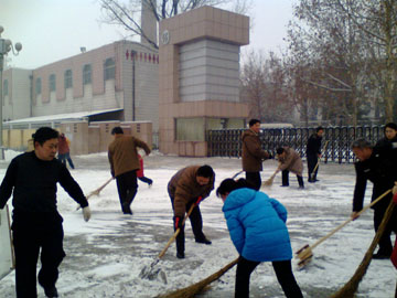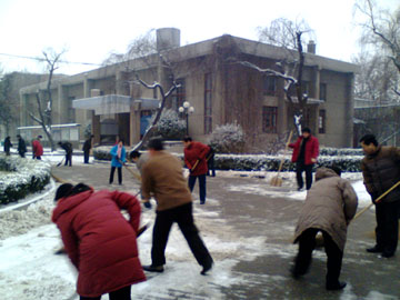 2008年的第一场雪给冬日的校园增添了一份美景,却也给行走带来很大的不便。为了保证道路交通的畅通无阻,今天一大早学院师生就自发组成了扫雪队,利用铁锨、扫帚等所有能利用的工具打扫积雪。大家干得热火朝天,丝毫不在意冰冷的寒风吹打在脸上。经过一个多小时的共同努力,各交通要道上的积雪被清理干净,给师生的出行提供了方便。