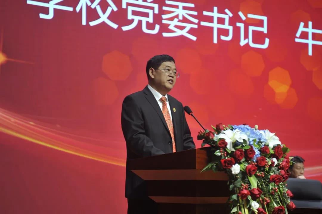 党委书记牛圣银代表学校,向莅临大会的各位嘉宾、关心支持学校发展的广大校友和社会各界致以热烈欢迎和衷心感谢。他指出,学校历经六十年辛勤耕耘,实现了办学地点从小胡同到大校园,专业建设从单一学科到多专业群,学生数量从几十到万人,办学性质从普通中专到合作开放高职院校的跨越式发展,现已发展成一所在校生万人规模的特色高职院校。学校坚持以学生为中心的教育理念和开放办学的理念,培养出一大批具有国际视野的高素质技术技能人才。