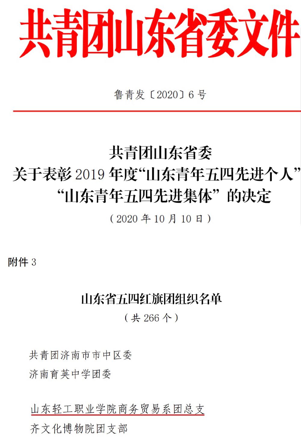 我校商务贸易系团总支获2019年度山东省五四红旗团组织荣誉称号