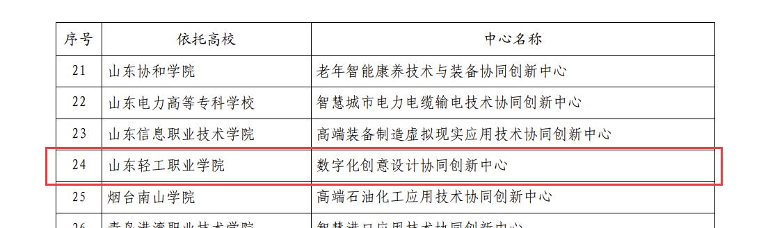 日前,山东省教育厅发布《关于公布山东省高等学校示范协同创新中心、山东省高等学校应用技术优质协同创新中心、山东省高等学校科技成果转化和技术转移基地等3类科研创新平台认定名单的通知》(鲁教科字【2020】6号),山东轻工职业学院艺术设计系数字化创意设计协同创新中心被山东省教育厅认定为山东省高等学校应用技术优质协同创新中心。