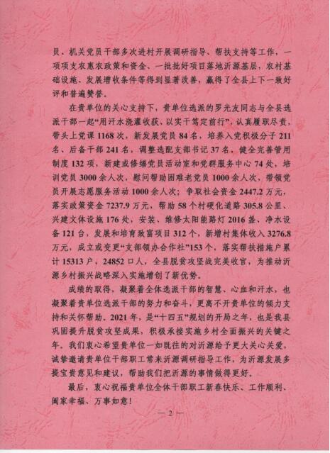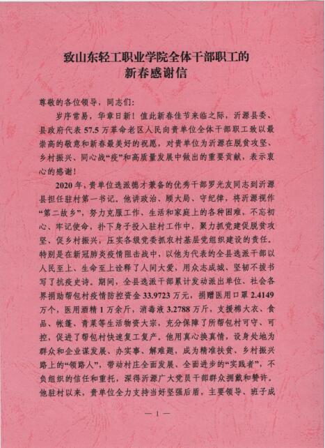 在信中,沂源县委、县人民政府代表革命老区人民向我校全体教职工致以最崇高的敬意和新春最美好的祝愿,对我校为沂源脱贫攻坚、乡村振兴、同心战疫和高质量发展做出的巨大贡献表示衷心的感谢。这是沂源县人民政府对我校在脱贫攻坚战中,驻村帮扶工作的反馈,更是一种认可,高度评价了我校在沂源县脱贫攻坚战中的表现。