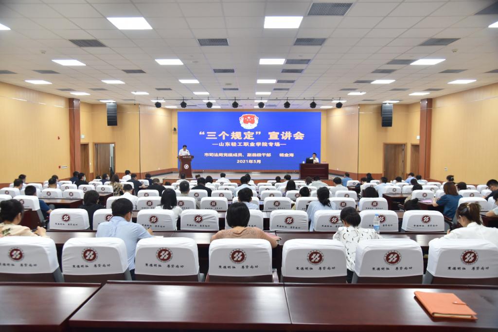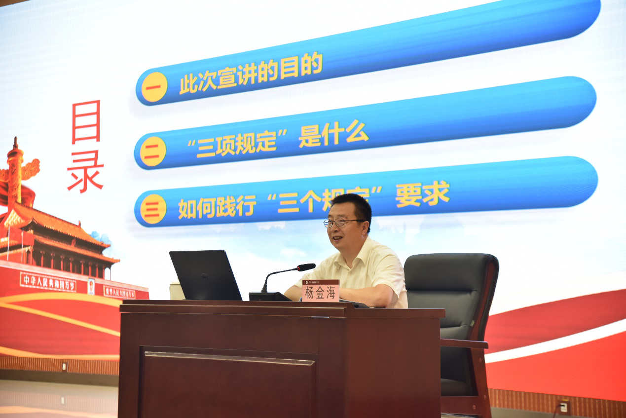 5月31日下午14:30,学校举办“三个规定”宣讲会。宣讲会邀请到了市司法局党组成员、副县级干部杨金海作报告,学校领导班子、科级以上干部参加,王星同志主持。