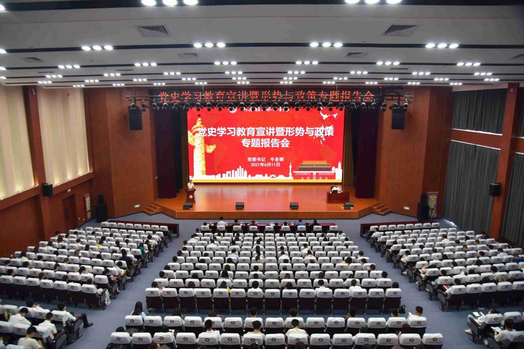6月11日,学校党委书记牛圣银作党史学习教育宣讲暨形势与政策专题报告会。党委中心组成员及师生代表共300余人聆听报告。党委副书记、院长孙才顺主持报告会。