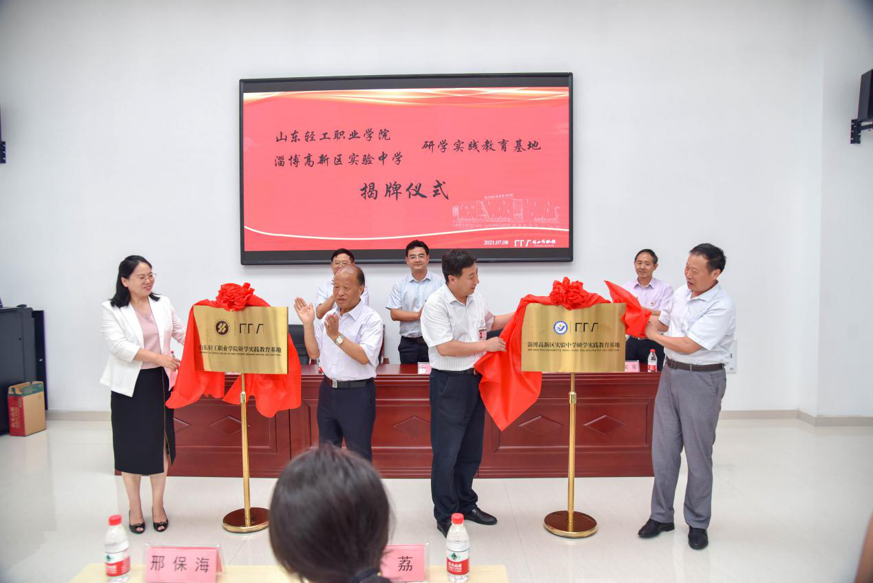 7月8日,山东轻工职业学院、淄博高新区实验中学研学实践教育基地揭牌仪式在淄博傅山自然地质博物馆举行,傅山集团党委书记彭荣均,淄博高新区实验中学校长陈传智,学校原党委书记牛圣银,党委委员、宣传部部长夏文燕、团委书记曹荔以及各方代表出席揭牌仪式。