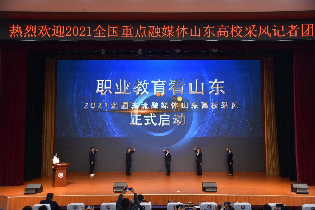 启动现场,学校党委副书记、院长孙才顺,山东省互联网传媒集团党委委员、副总经理姜长勇,学校党委副书记袁雷,学校党委委员、宣传部长夏文燕,大众网市场运营中心副主任、教育文旅事业部主任陈新共同按下启动键,伴随着全场的倒计时声,“职业教育看山东——2021全国主流融媒体山东高校采风”活动正式拉开了序幕。