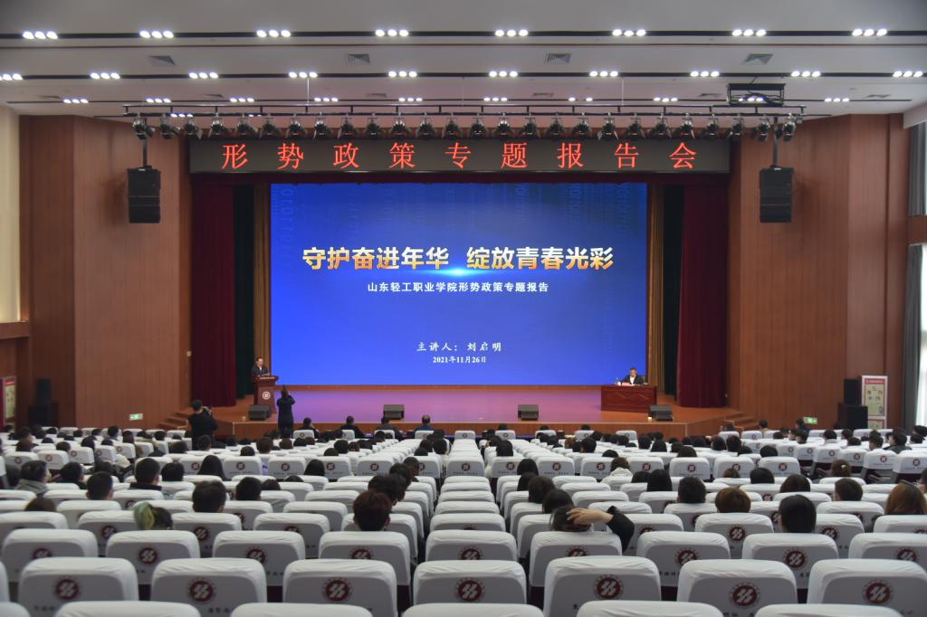 11月26日,淄博市副市长、市公安局党委书记、局长刘启明同志来我校作形势政策专题报告,宣讲党的十九届六中全会精神,介绍全市公安工作有关情况,分析社会治安面临的风险形势,勉励青年学生努力学习、掌握本领,在新时代大潮中建功立业,书写不一样的青春华章。学校党委中心组全体成员、各党总支书记、全体思政课教师和部分师生代表聆听报告。报告会由党委副书记、院长孙才顺同志主持。