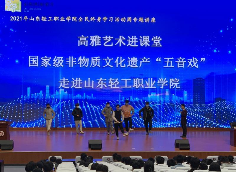 为推进学校全民终身学习活动开展,12月3日,“国家级非物质文化遗产‘五音戏’走进山东轻工职业学院”专题讲座在我校举行。讲座特邀淄博市五音戏艺术传承保护中心优秀演员史晓睿及其团队主讲,全校400余名师生参加。