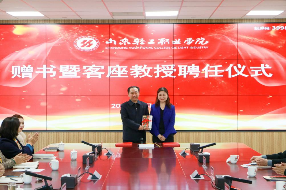 陆生教授向学校捐赠了《走进美国电视》《生逢纽约》两册图书,孙才顺院长向陆生教授颁发了客座教授聘任证书。陆生教授长期致力于教育研究,熟悉高等职业教育发展规律,多年从事新闻媒体工作,有着丰富的国际合作交流工作经验,在国际化人才培养、专业课程设计等方面造诣深厚、成果丰硕。聘请陆生教授,对学校发展和专业建设有着重要意义。