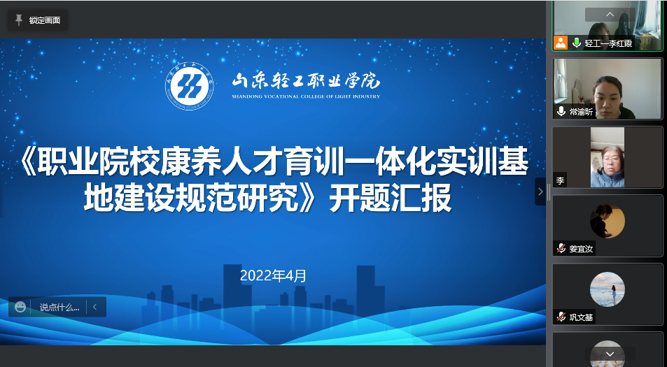 4月15日,我校召开中国职业技术教育学会立项课题《职业院校康养人才育训一体化实训基地建设规范研究》线上开题论证会。山东康养职业学院(筹)院长、教育部全国职业院校培训行动计划专家委员会委员、中国职业技术教育学会职业院校培训工作委员会秘书长、中国成人教育协会企业继续教育委员会副理事长吴树罡,欣悦健康科技有限公司部门经理任新忠,淄博市鲁韵随风养老院院长徐霞,周村区社会福利托养康复中心院长李蕾等专家出席开题会议。课题组全体成员参加了开题论证。