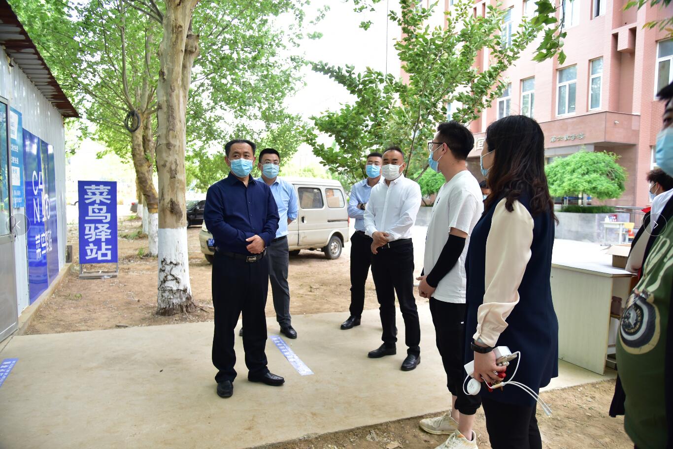 4月26日下午,学校领导孙才顺一行到恒学楼东侧快递驿站调研,深入了解快递驿站建设和疫情防控等情况。