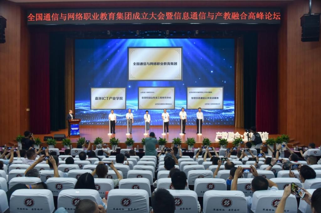 全国通信与网络职业教育集团由学校、中电网络通信集团有限公司、中国电子劳动学会校企合作促进会等单位牵头组建,旨在促进通信与网络职业教育与经济社会发展需求的紧密对接,打造校企命运共同体,加速推动数字产业创新发展、培育数字人才。成立大会上为学校“山东省工程技术研发中心”“山东省新旧动能转换公共实训基地”“华为信息与网络技术学院”“嘉环ICT产业学院”揭牌。聘任宋承祥、高鸿、郑立森为职教集团首席专家。会议选举产生了第一届常务理事、副理事长、理事长和单位。学校被选为集团理事长单位,孙才顺被选为理事长。