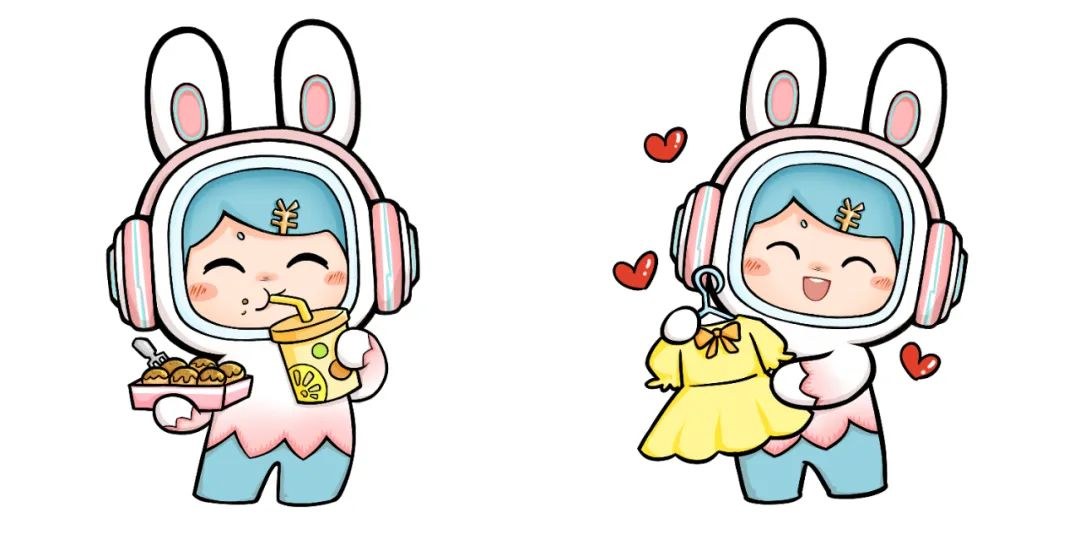 花花的小兔子造型主打年轻人喜爱的萌文化,寓意消费活跃,生活幸福,总有钱花;她泉水造型的头发搭配荷花裙子,突出了济南泉城文化元素,开心购物的样子软萌又可爱。