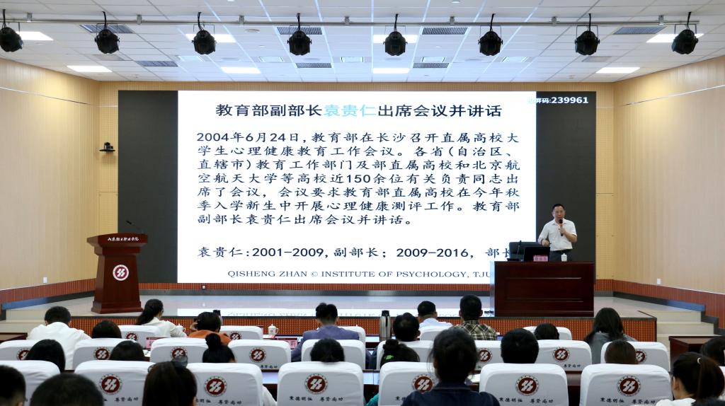 讲座由中国心理学会心理危机干预工作委员会副主任、全国高校心理委员研究协作组首任组长与常务理事、天津大学心理研究所所长詹启生教授主讲,学校党委副书记唐勋出席讲座并讲话,学生工作处处长杨永亮主持讲座。