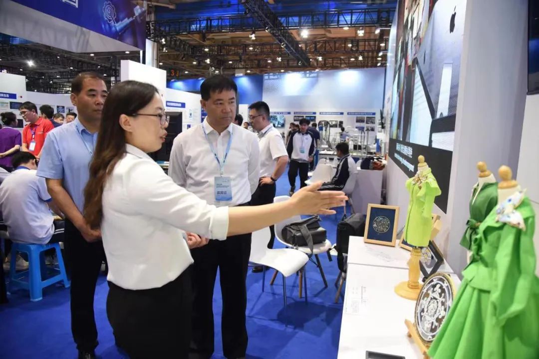 教育部原副部长、中国职业技术教育学会会长鲁昕、中国纺织服装教育协会会长倪阳生、淄博市人民政府副市长毕红卫等领导参观山东轻工职业学院展区。