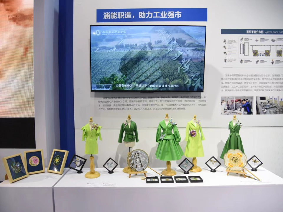 本站讯5月14日,2023年职业教育活动周全国启动仪式暨技能大赛开幕式在山东省潍坊市鲁台会展中心举行,我校高定服装系列产品,与服装相搭配的精美法绣、珠绣配饰,以及草木染丝绸作品在活动现场精彩亮相。