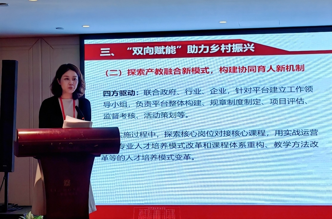 同步举行的“数智人才培养暨产教融合创新发展”分论坛环节,焦翠平以《校企“双向赋能” 助推产教融合深度发展》为题作了交流发言,介绍了学校在共建混合所有制二级学院、社会服务、就业创业等方面开展的一些探索和实践;分享了校企共建乡村振兴产业学院,助推当地名优特新产品上行,为脱贫攻坚和乡村振兴赋能助力的成功做法。