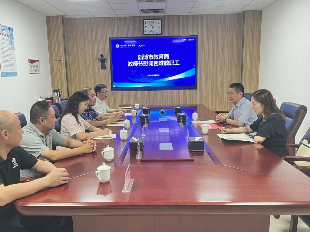 本站讯(通讯员 崔英)9月4日,淄博市委教育工委委员、市教育局党组成员、副局长周晶元一行,为广大教职员工送来祝福,殷切探望慰问我校病困教职工代表并送来了慰问金。学校党委副书记、校长袁雷,党委副书记唐勋,工会相关负责同志参加座谈。