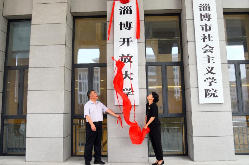邓俊庆与胡晓鸿共同为淄博开放大学揭牌。