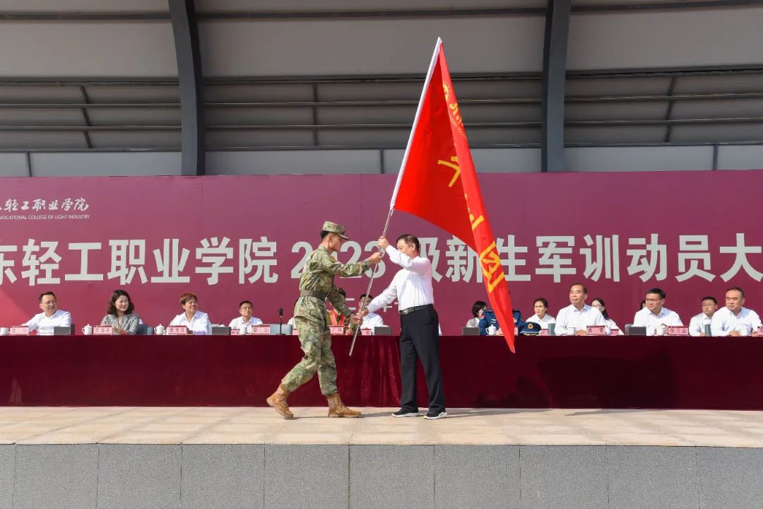 大会在庄严的国歌声中开幕,全体师生面向国旗共唱国歌。学校党委书记范桂君向2023级新生军训团团长聂书展授旗。