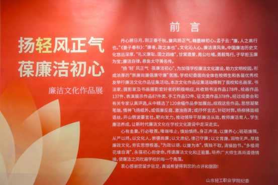 近日,山东轻工职业学院以推动清廉学校建设为契机,围绕筑牢守好师德师风底线,创新开展了“扬‘轻’风正气 葆廉洁初心”廉洁文化作品展,通过以文化人,教育师生崇德尚廉;通过以文肃纪,要求师生律己守廉;通过以文育廉,夯实师生思想根基,持续巩固作风建设成果,推动“清廉学校”建设工作与中心工作同频共振,促进学校高质量发展。