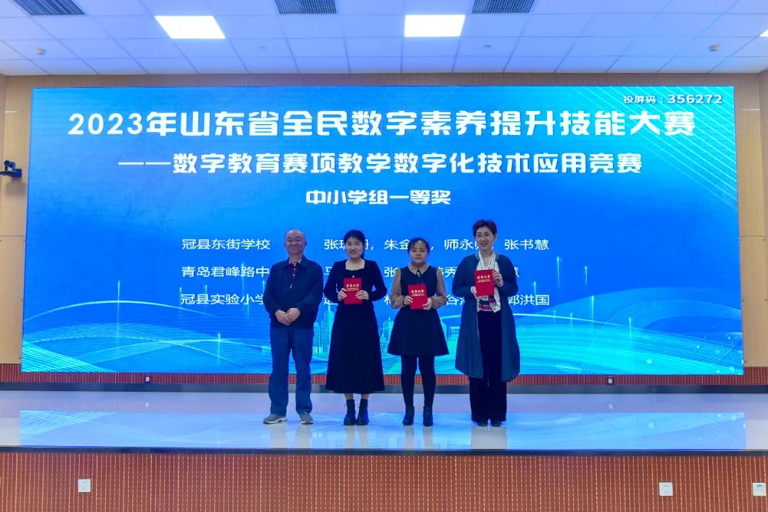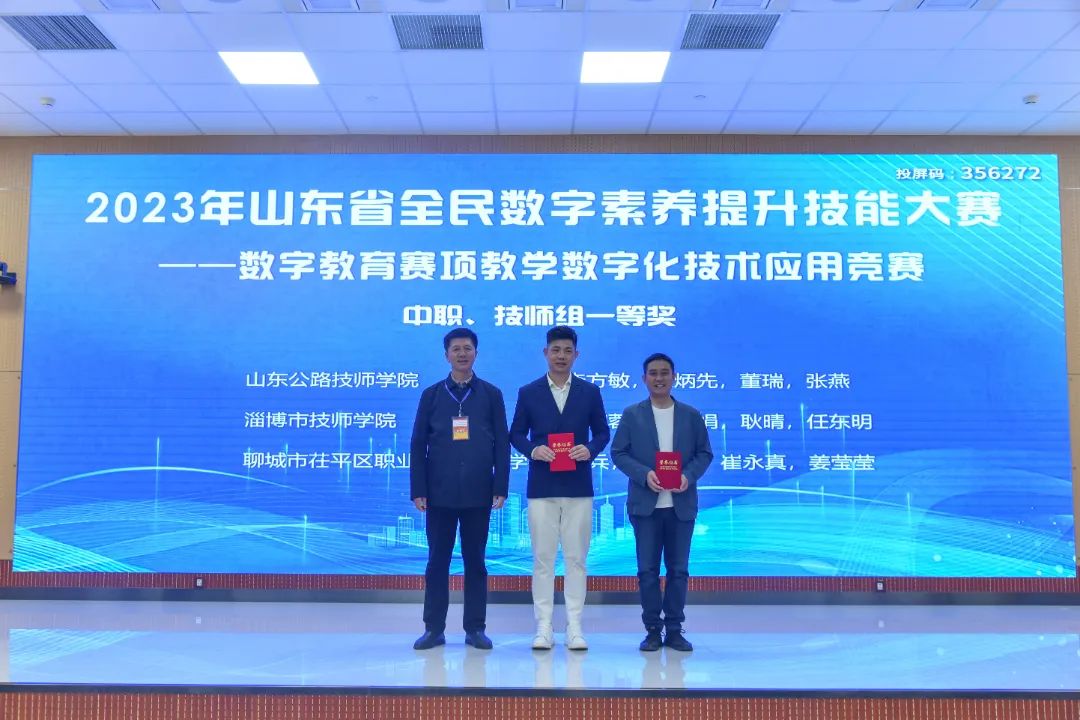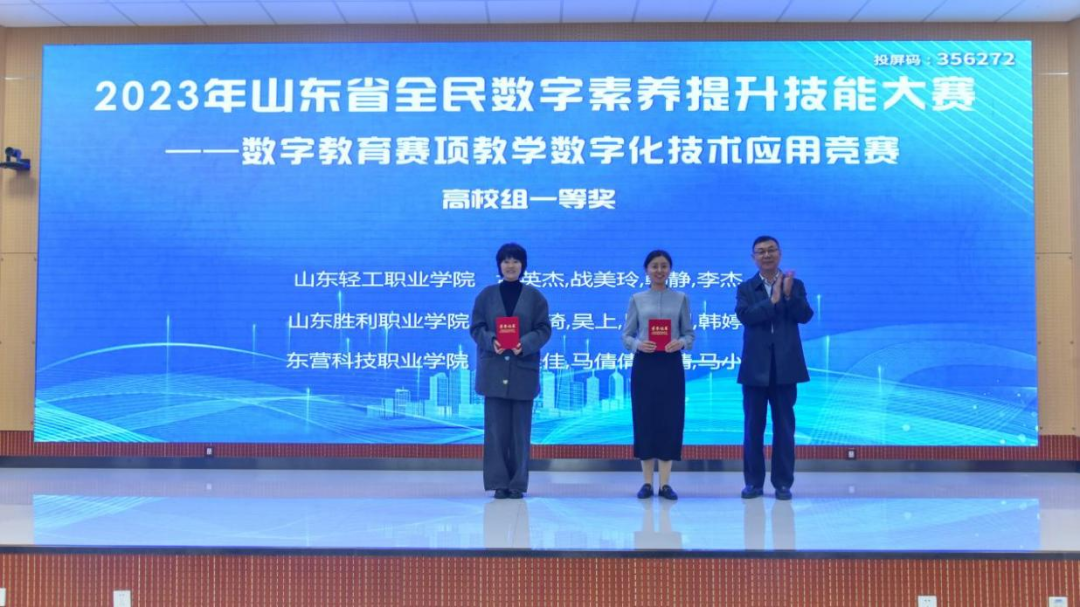 本站讯(通讯员 韩静)11月3日至4日,2023年山东省全民数字素养提升技能大赛——数字教育赛项教学数字化技术应用竞赛决赛在山东轻工职业学院成功举办。来自全省的48支队伍进入决赛答辩环节,经过激烈角逐,最终我校孟英杰、战美玲、韩静、李杰团队获得高校组一等奖的好成绩。