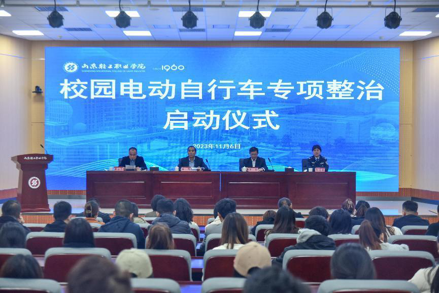 本站讯(通讯员 张越)11月6日下午,山东轻工职业学院校园电动自行车交通安全专项整治启动仪式,在学校第四多功能厅顺利召开。学校党委副书记、校长袁雷,党委副书记唐勋,党委委员、副院长李志刚和周村区交警大队一中队中队长张迎春出席本次活动,各系院党总支(直属党支部)书记、各二级单位负责人、师生代表一同参加了本次启动仪式。启动仪式由党委委员、副校长李志刚主持。